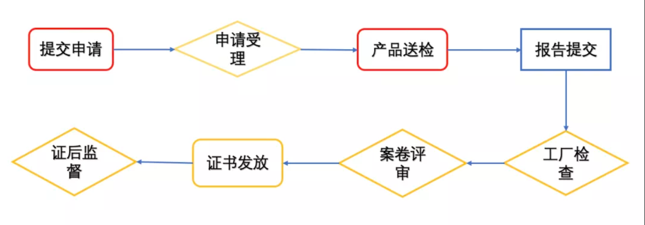 首次認(rèn)證一般流程(紅框?yàn)檎J(rèn)證企業(yè)操作,黃框?yàn)檎J(rèn)證機(jī)構(gòu)操作,藍(lán)框?yàn)闄z驗(yàn)機(jī)構(gòu)操作)